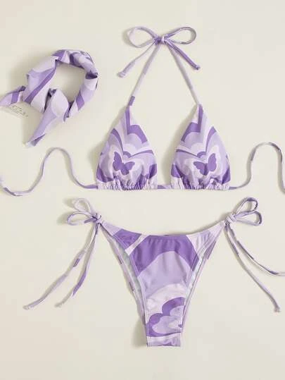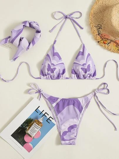 3pack Butterfly Print Triangle Bikini Swimsuit & Bandana