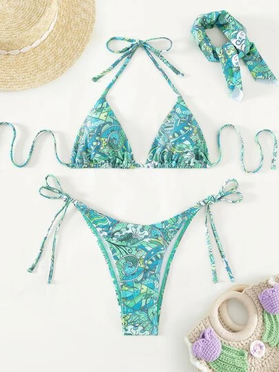 Allover Print Halter Triangle Bikini Swimsuit With Headband