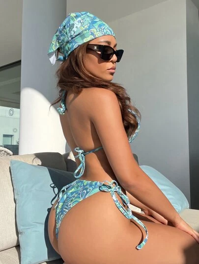Be the first to review “Allover Print Halter Triangle Bikini Swimsuit With Headband” Cancel reply