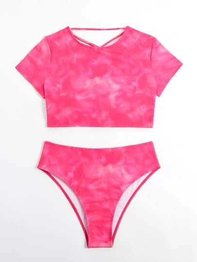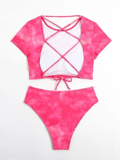 BOUDOIRCORE Tie Dye Bikini Set Short Sleeve Lace Up Backless Tee & High Waisted Bottom 2 Piece Bathing Suit