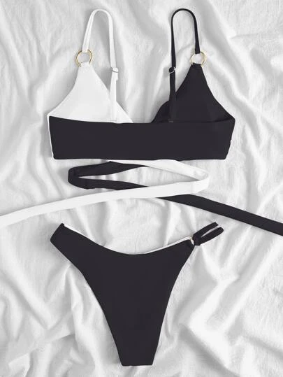Color Block Bikini Set Criss Cross Wrap Bra & Cheeky Bottom 2 Piece Bathing Suit