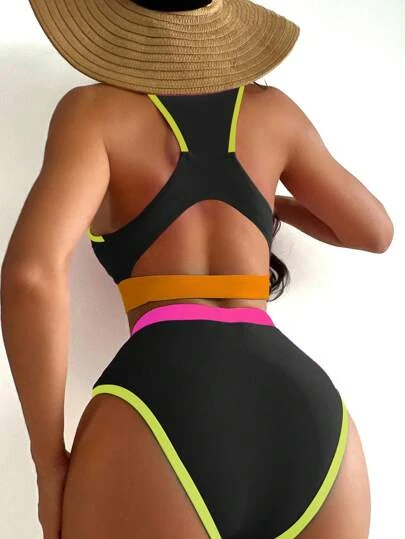 Colorblock Contrast Binding High Waisted Bikini Swimsuit