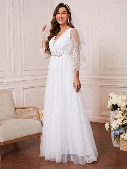 Contrast Lace Rhinestone Detail Mesh Overlay Wedding Dress