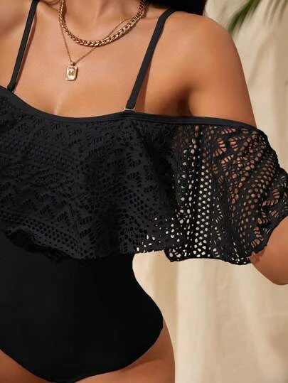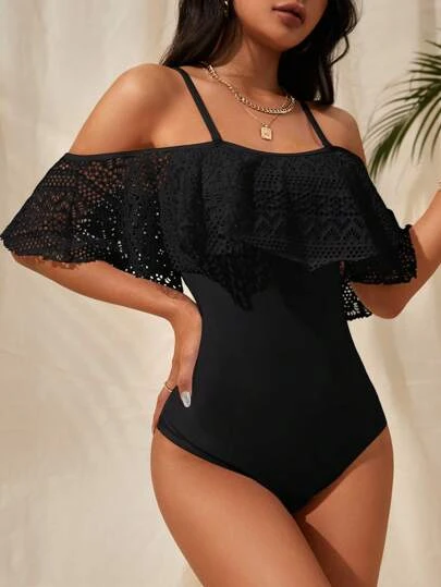 Contrast Lace Ruffle Trim Cold Shoulder One Piece Swimsuit
