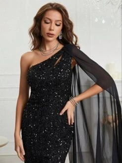Asymmetrical Neck Ruffle Trim Split Thigh Sequin Formal Dress