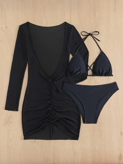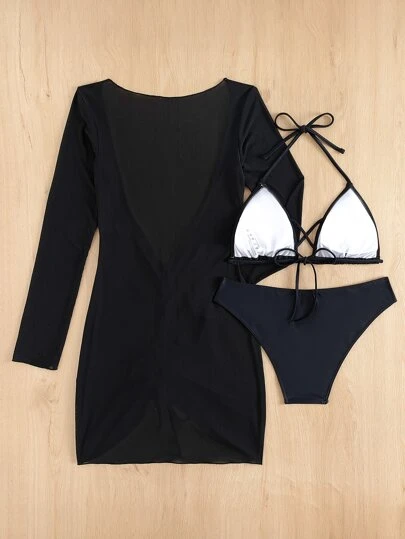 Criss Cross Halter Triangle Bikini Swimsuit With Cover Up