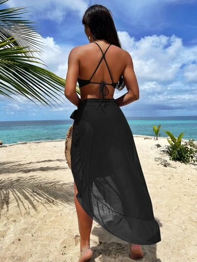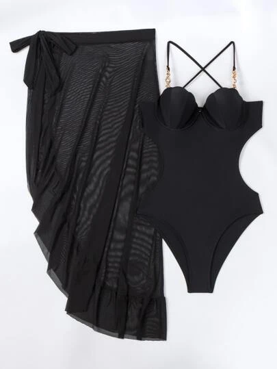 Cut-out Chain Detail One Piece Swimsuit With Beach Skirt