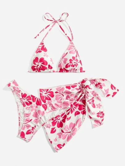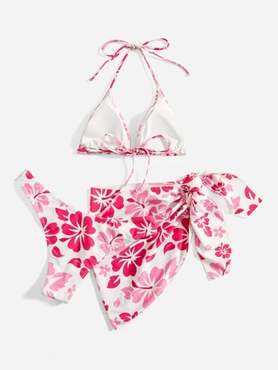 Floral Bikini Set Halter Micro Triangle Bra & Bikini Bottom & Cover Up Skirt 3 Piece Bathing Suit