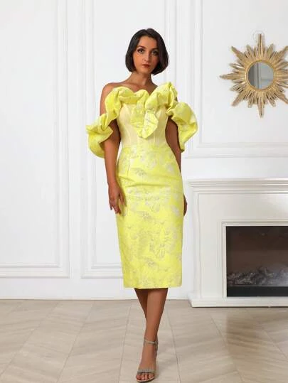 Floral Jacquard Ruffle Trim Off Shoulder Dress