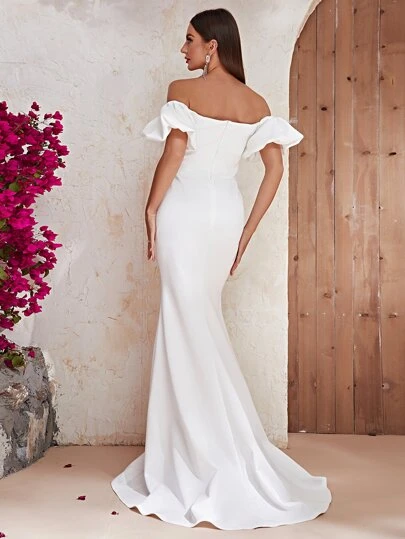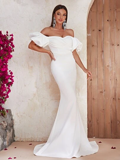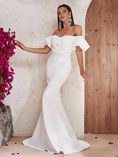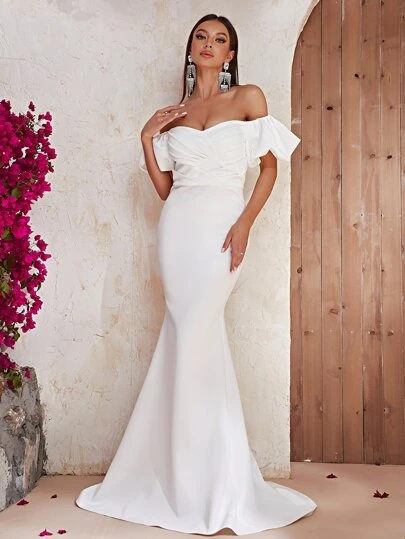 Giffniseti Off Shoulder Ruched Bust Mermaid Hem Satin Formal Dress