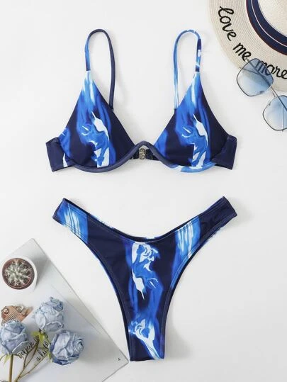 Graphic Print Bikini Set Underwire Bra Top & High Cut Bikini Bottom 2 Piece Swimsuit