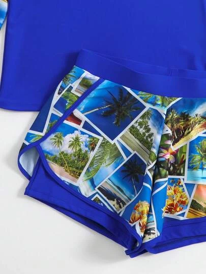 Graphic Print Bikini Swimsuit With Long Sleeve Swim Shirt