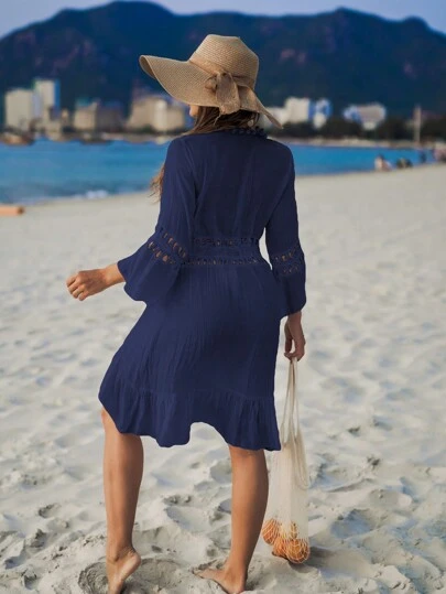 Guipure Lace Insert Flounce Sleeve Ruffle Hem Tie Front Kimono