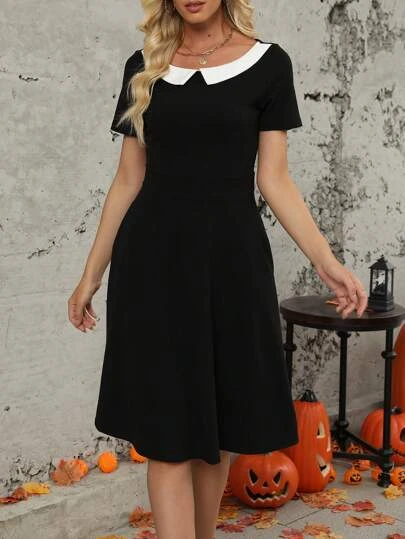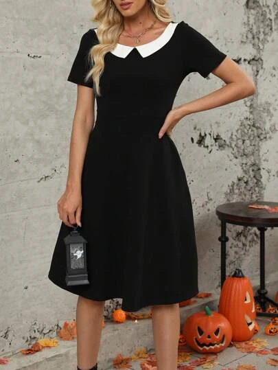 Halloween Wednesday Adams Black Dress Cosplay Costumes Black A-line Dress Short Sleeves