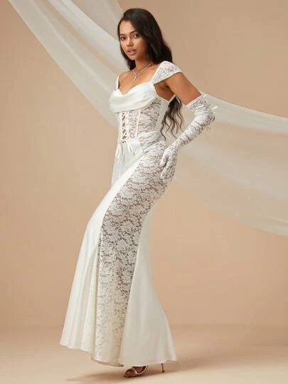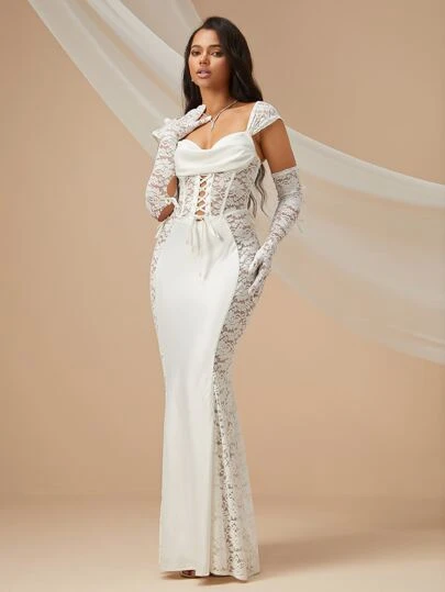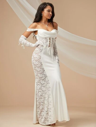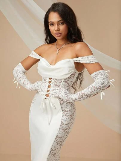 Lace Up Front Lace Bodycon Wedding Dress With Arm Sleeves