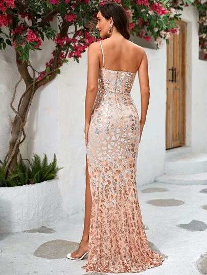 LOVE&LEMONADE One Shoulder Split Thigh Sequin Formal Dress