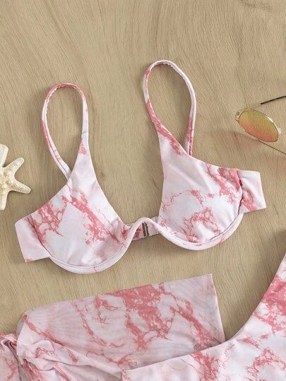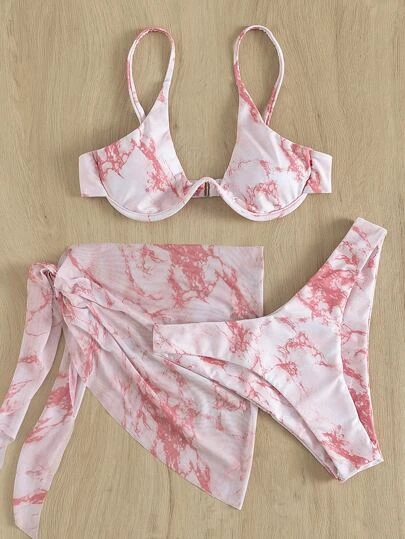 Marble Print Bikini Set Underwire Buckle Back Bra & High Cut Bottom & Beach Skirt 3 Piece Bathing Suit