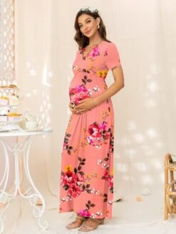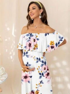 DEARCASE Maternity Floral Print Off Shoulder Ruffle Trim Dress