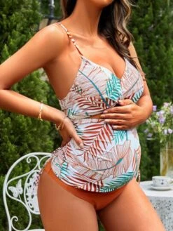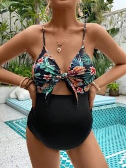 SHEIN Maternity Tropical Print Knot Front One Piece Swimsuit