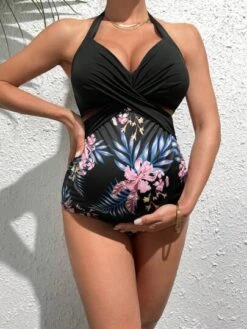 SHEIN Maternity Tropical Print Halter Push Up One Piece Swimsuit