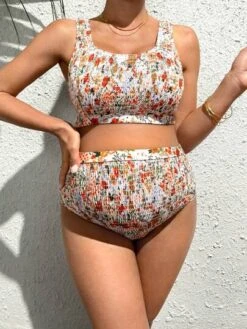 SHEIN Maternity Floral Print High Waisted Smocked Bikini Swimsuit