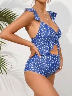 SHEIN Maternity Ditsy Floral Print Cut Out Ruffle Trim One Piece Swimsuit