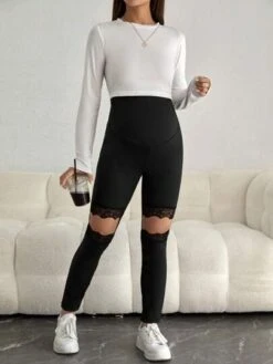 SHEIN Maternity Adjustable Waist Contrast Lace Cutout Leggings