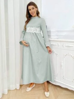 Maternity Mock Neck Contrast Guipure Lace Flounce Sleeve Dress