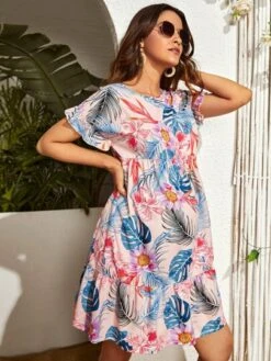 SHEIN Maternity Tropical Print Ruffle Trim Knot Side One Piece Swimsuit