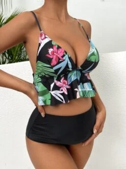 SHEIN Maternity Tropical Print Tie Front Bikini Swimsuit With Beach Skirt