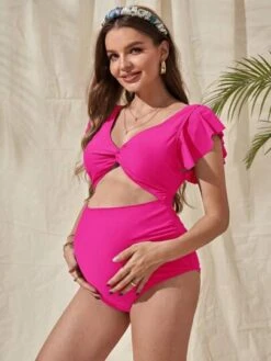SHEIN Maternity Twist Cut Out Ruffle Trim One Piece Swimsuit