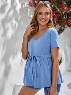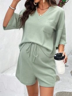 SHEIN Maternity Waffle Knit Drop Shoulder Tee & Adjustable Waist Shorts
