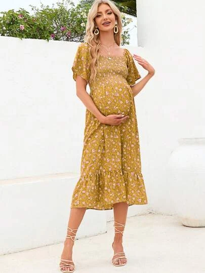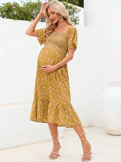 Maternity Ditsy Floral Print Ruffle Hem Dress