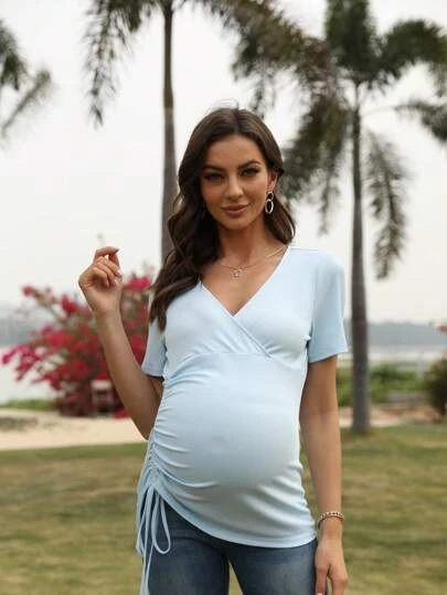 Maternity Surplice Neck Drawstring Side Tee