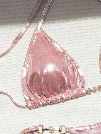 Metallic Chain Linked Halter Triangle Bikini Swimsuit
