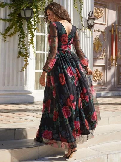 Missord Floral Print Lantern Sleeve Ruched Mesh Maxi Dress