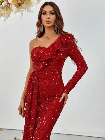One Shoulder Ruffle Trim Draped Sequin Formal Dress