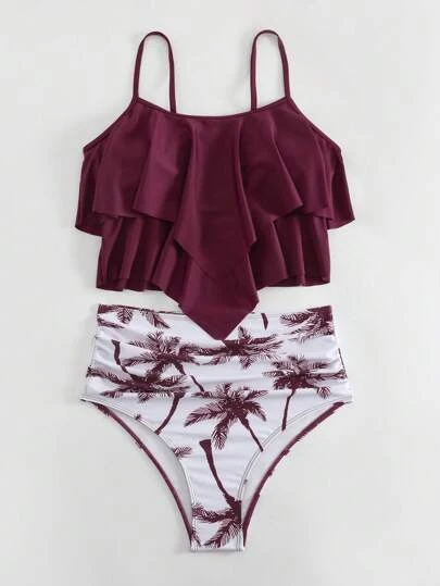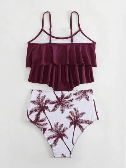 Palm Tree Print Ruffle Hem Bikini Swimsuit