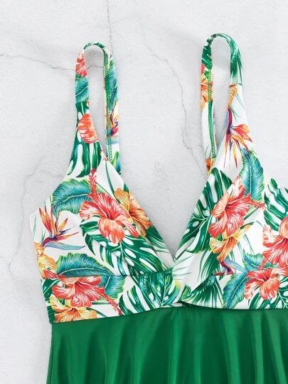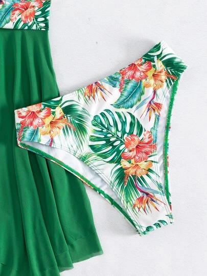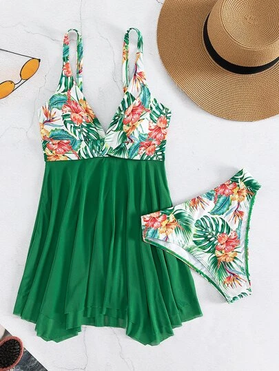 Plant Print Swim Dress With Bikini Bottom
