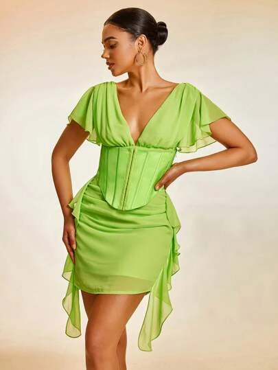 Plunging Neck Butterfly Sleeve Ruffle Trim Corset Detail Mesh Dress