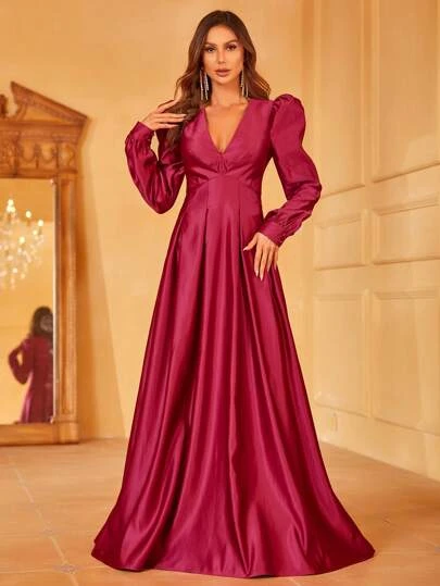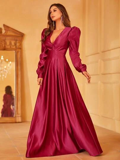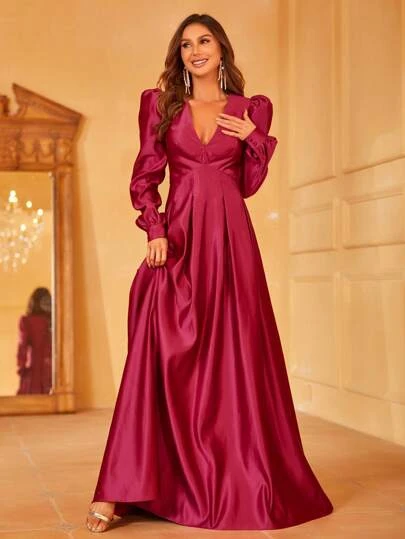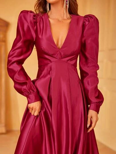 Plunging Neck Puff Sleeve Fold Pleated Satin Formal Dress