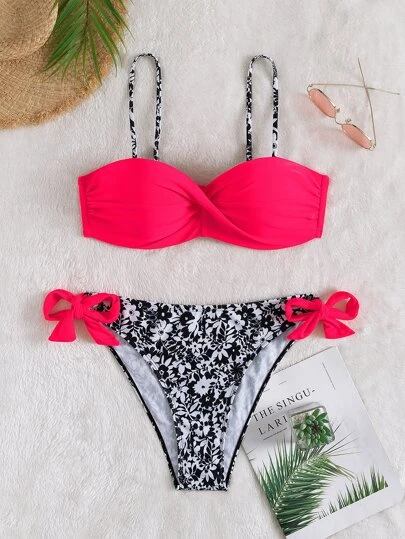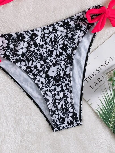 Random Floral Print Wrap Cross Tie Back Push Up Bikini Swimsuit