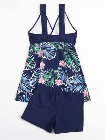 Random Tropical Print Tankini Set Knot Strap Longline Tank Top & Boxer Shorts 2 Piece Swimsuit