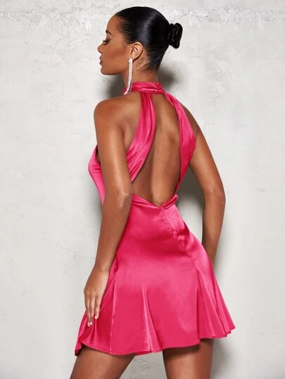 SHEIN BAE Solid Satin Halter Neck Backless Dress