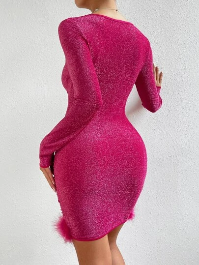 SHEIN BAE Sweetheart Neck Fuzzy Trim Ruched Metallic Bodycon Dress