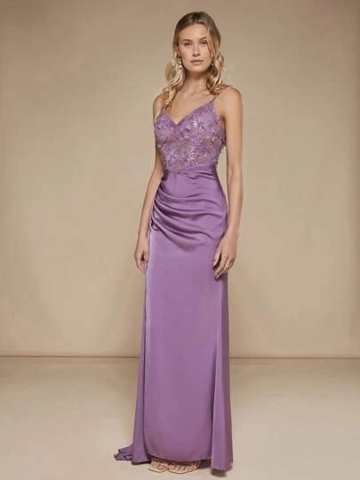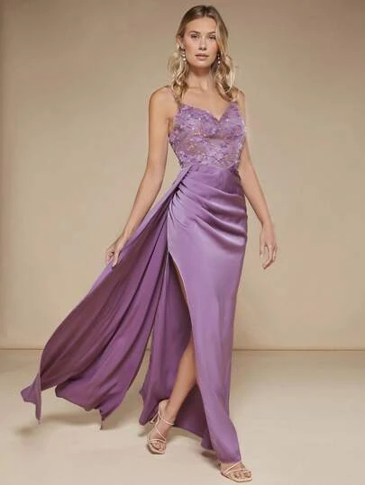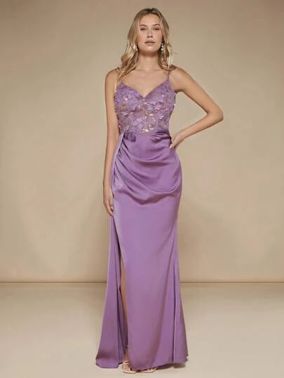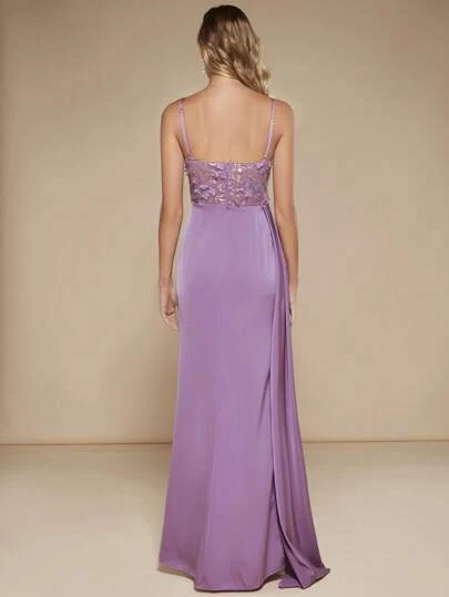 SHEIN Belle Contrast Sequin Split Thigh Satin Cami Dress