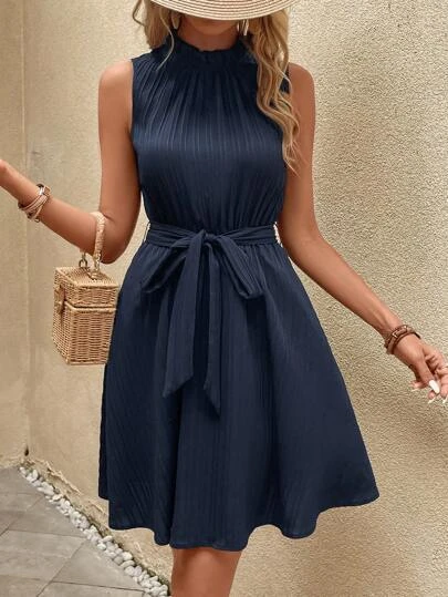 SHEIN Clasi Frill Neck Hidden Pocket Belted Dress