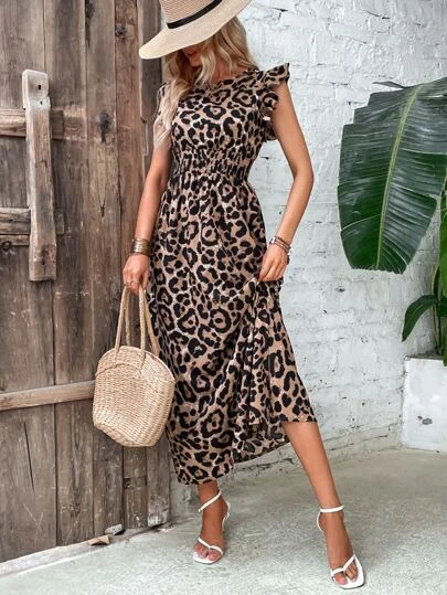 SHEIN Clasi Leopard Print Ruffle Trim Split Thigh Dress