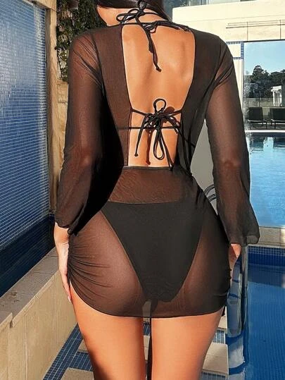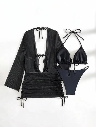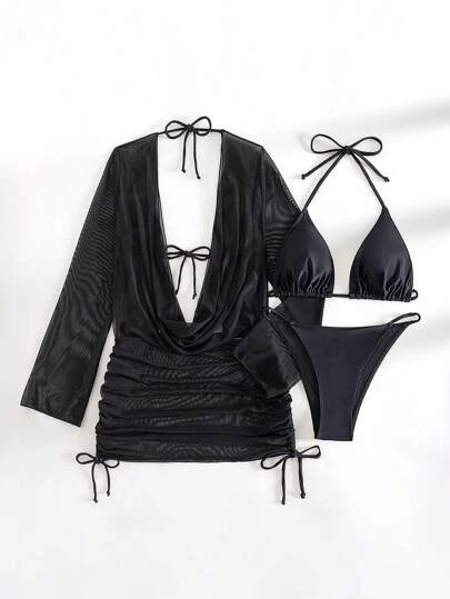 SHEIN DD+ Plain Halter Triangle Bikini Swimsuit With Cover Up