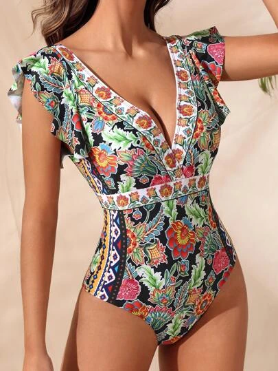 SHEIN Floral Print Ruffle Trim Plunging Neck Ruffle Trim One Piece Swimsuit